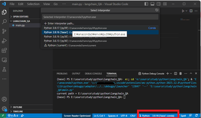 이제 F5를 눌러 실행을 해보면 인터프리터와 환경이 모두 py39로 실행되는 것을 알 수 있습니다.