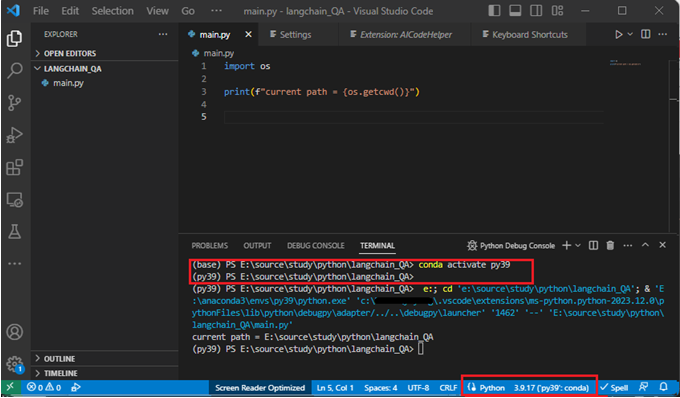 이제 F5를 눌러 실행을 해보면 인터프리터와 환경이 모두 py39로 실행되는 것을 알 수 있습니다.