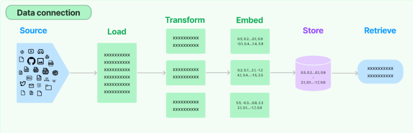많은 LLM 애플리케이션에는 모델 훈련 세트의 일부가 아닌 사용자별 데이터가 필요합니다. LangChain은 데이터를 로드, 변환, 저장 및 쿼리할 수 있는 빌딩 블록을 제공합니다: