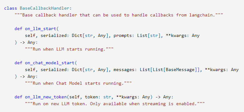 이는 로깅, 모니터링, 스트리밍 및 기타 작업에 유용하며 API 전체에서 사용할 수 있는 콜백 인수를 사용하여 이러한 이벤트를 받을 수 있습니다.